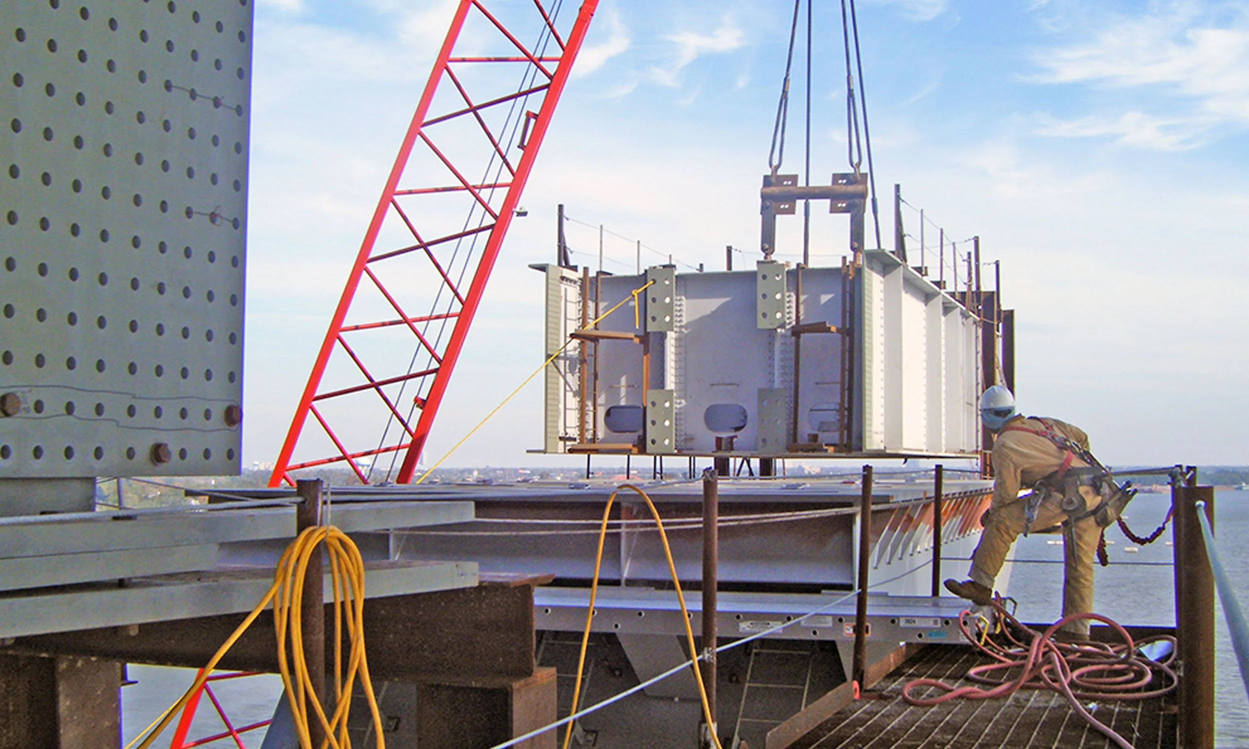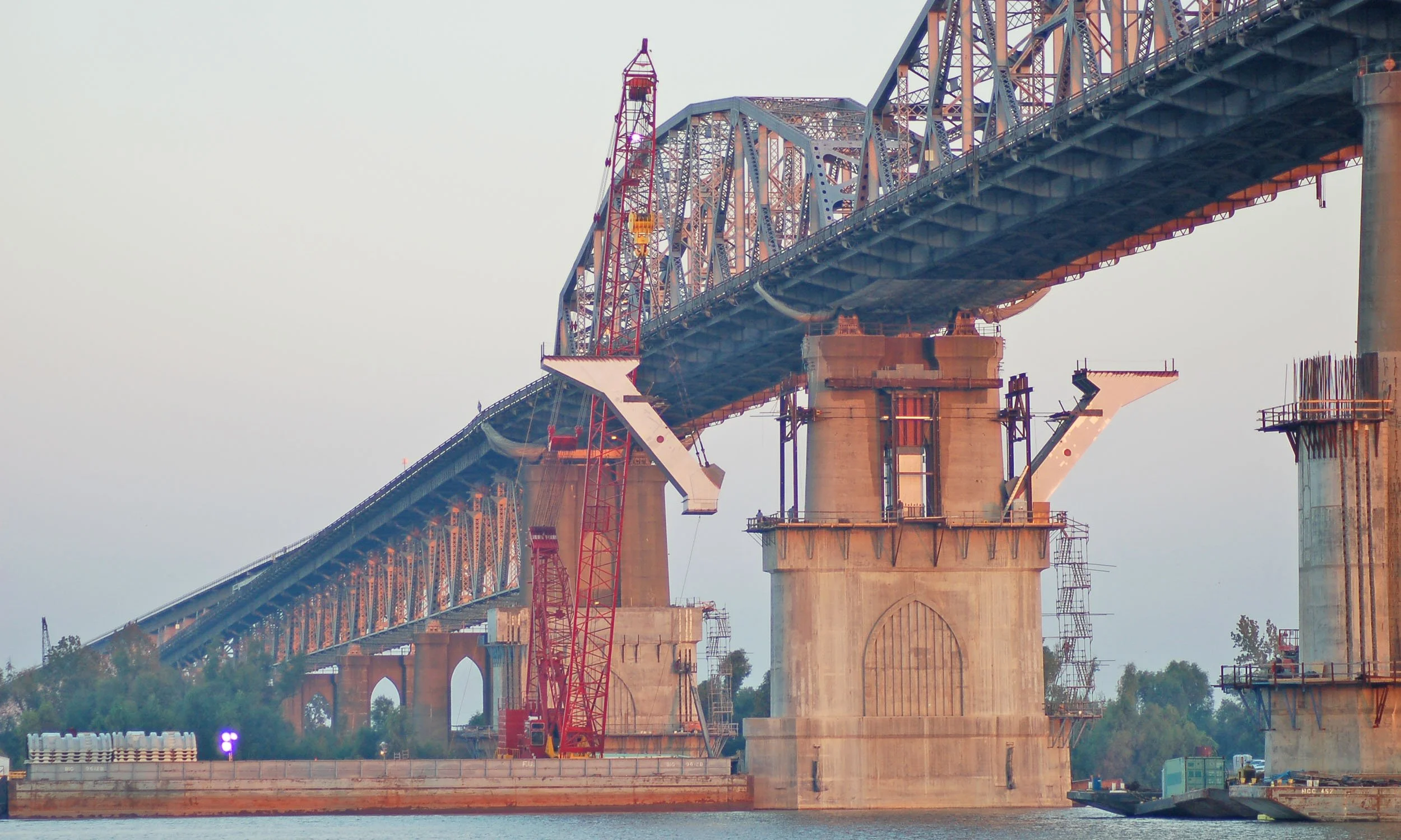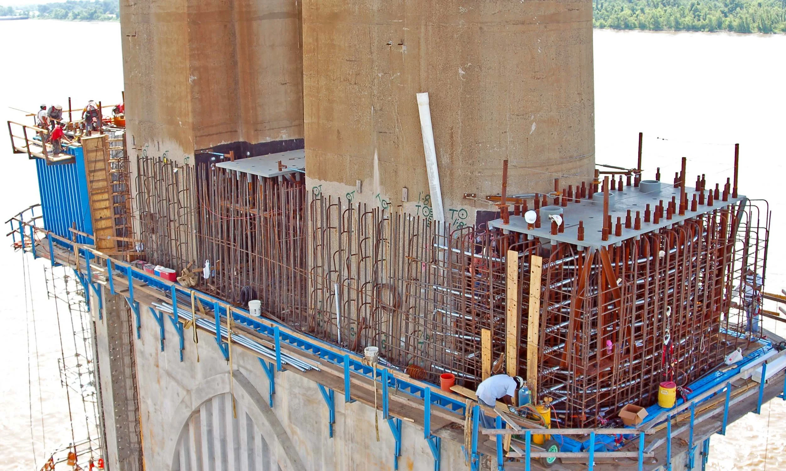 The concrete encasement, for a total of 17,000 cubic yards, included drilling for 16,000 anchors to the existing piers and lateral post-tensioning. The structural steel frames required 20 critical crane barge lifts of 150 to 200 tons. The 4500 tons of structural steel fabrication required special procedures due to the precise fit-up of heavy sections and fracture critical welding requirements. The structural steel was fabricated, pre-assembled, and shipped by barge to the job site.