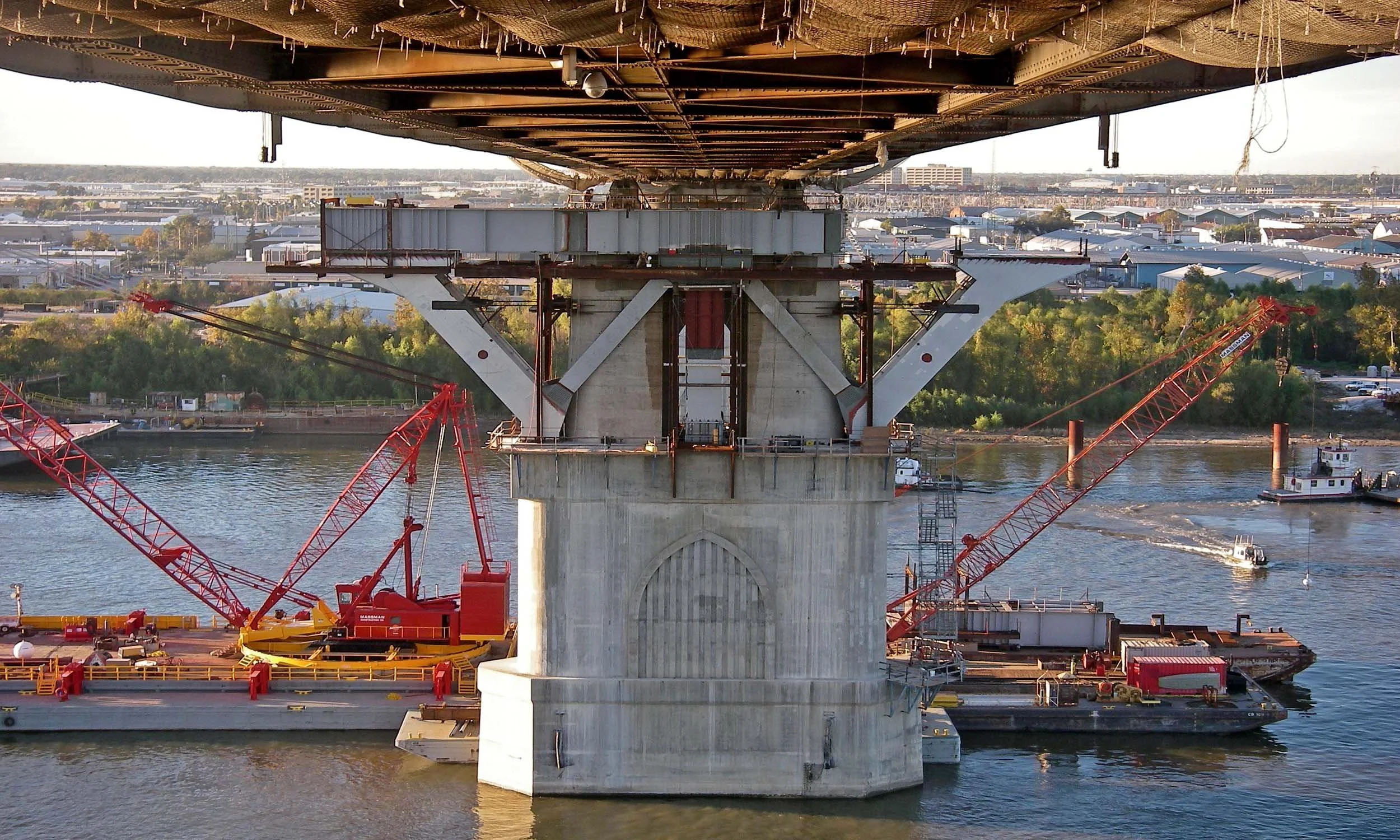The project’s location and scope presented several challenges to the Massman team. Crane barge access in the main river channel required constant coordination with Mississippi River shipping and barge operators. The river depths approached 90 feet which required substantial anchoring of crane barges. Work was suspended for several extended periods due to river flood stages and tropical storms. The river currents and swift eddies near the piers required divers and marine equipment to operate safely.