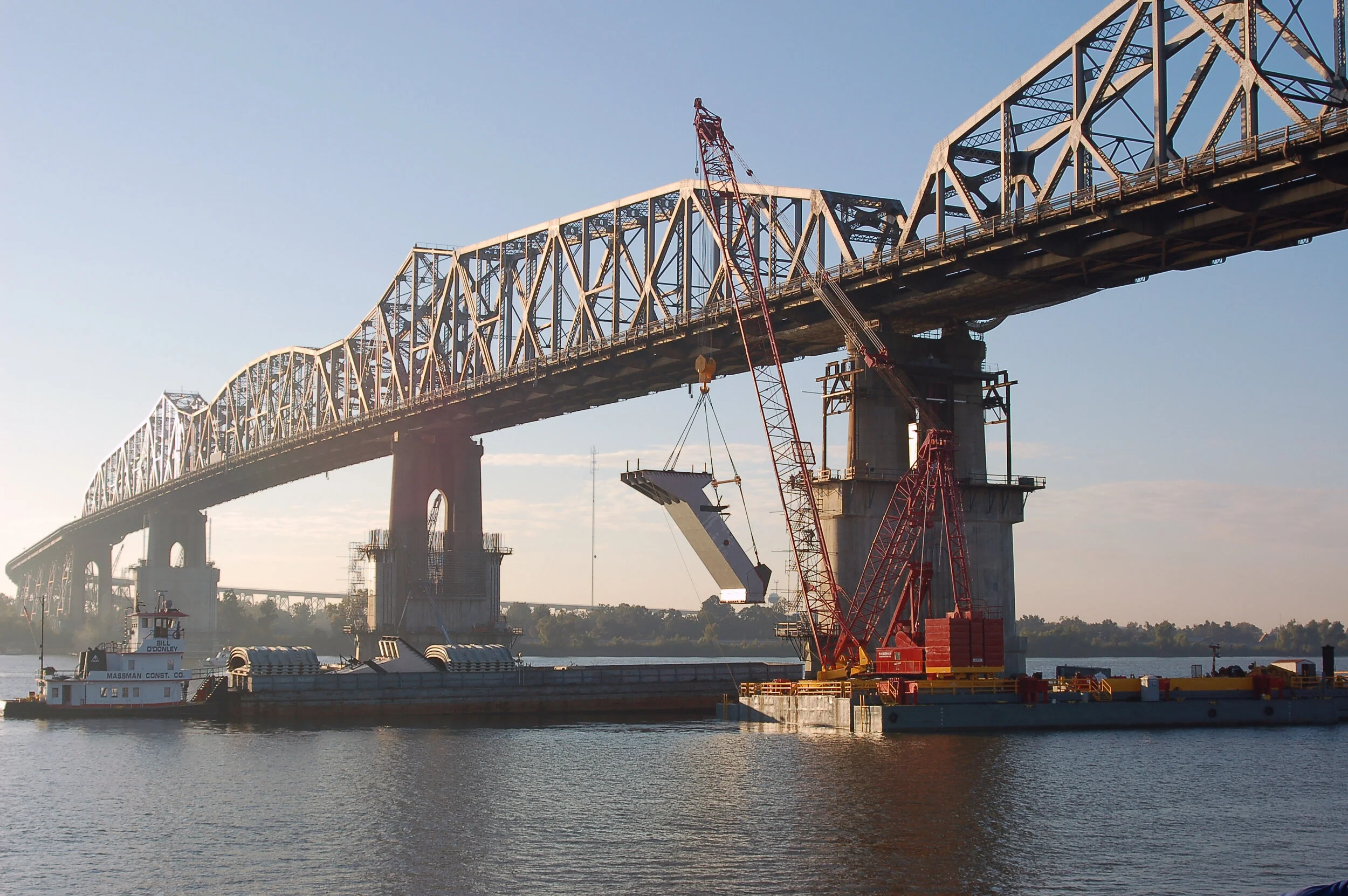 This Massman-led joint venture project added trusses on each side and replaced the existing traffic lanes with 3 widened lanes and shoulders. The main span is 2,375 feet long in four spans. The widening scope included over 17,000 tons of structural steel, and extensive retrofitting of the existing trusses to accept connections to the new trusses.