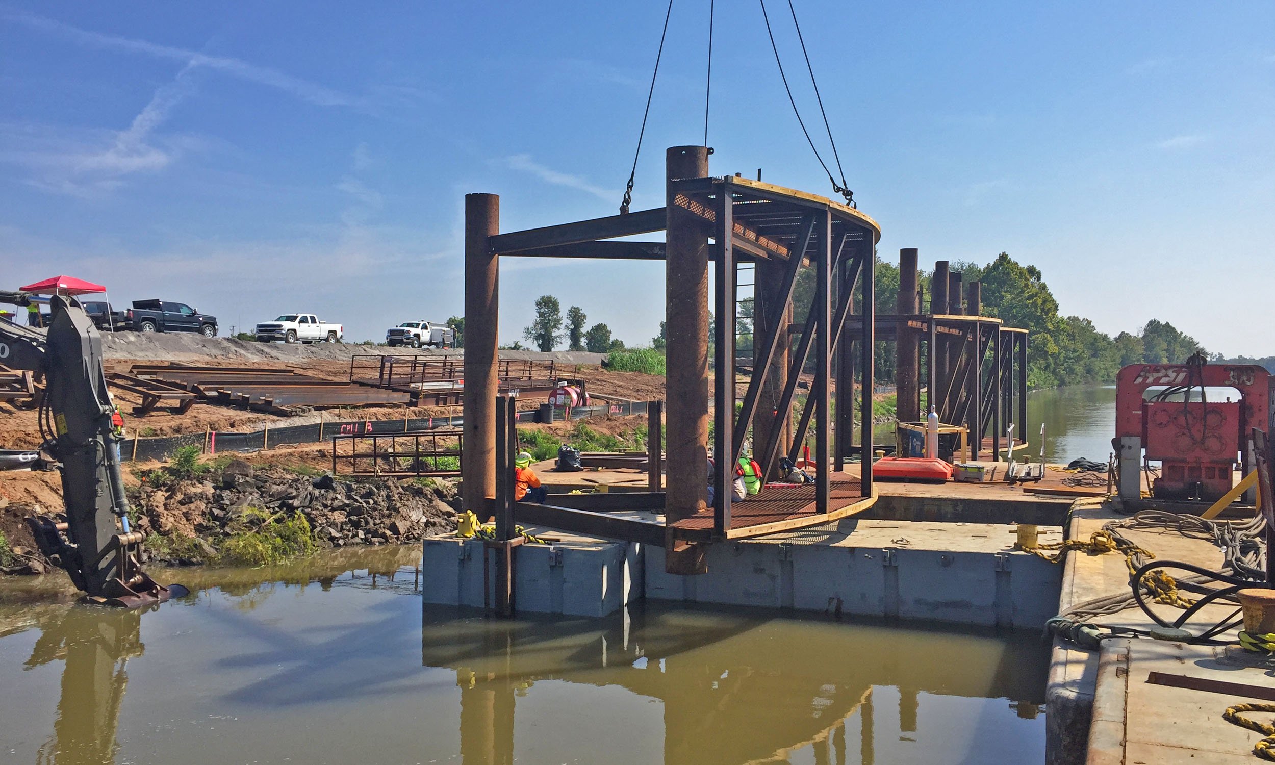This project for Little Rock Port Authority (LRPA) includes a new dock and rail system to transport products to and from Slackwater Harbor via barge and rail. Construction includes 2,200 feet of railroad track, two turnouts, 3,500 cubic yards of excavation, 21,500 cubic yards of embankment construction, and 8,500 tons of aggregate base course for new road construction. The new dock includes eight open cells composed of sheet pile.